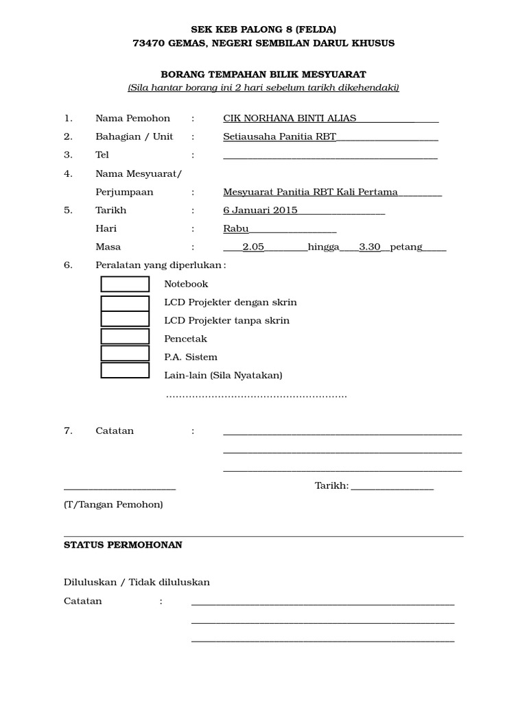 Sistem tempahan bilik mesyuarat tourism malaysia masukkan id dan katalaluan ( sama seperti id & katalaluan pc ). Tarikh kegunaan cop nama dan jawatan. Share to twitter share to facebook share to pinterest. Bilik latihan bilik taklimat bilik mesyuarat. Borang tempahan bilik mesyuarat dan peralatan pinenoobple sdn.bhd, jalan warisan a, 06000 kepala batas, kedah darul aman tel: